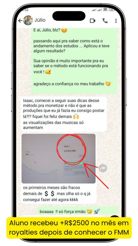 Acesso a uma comunidade exclusiva no WhatsApp para trocar experiências, tirar dúvidas, compartilhar produções e evoluir junto com outros músicos que também estão monetizando suas músicas.